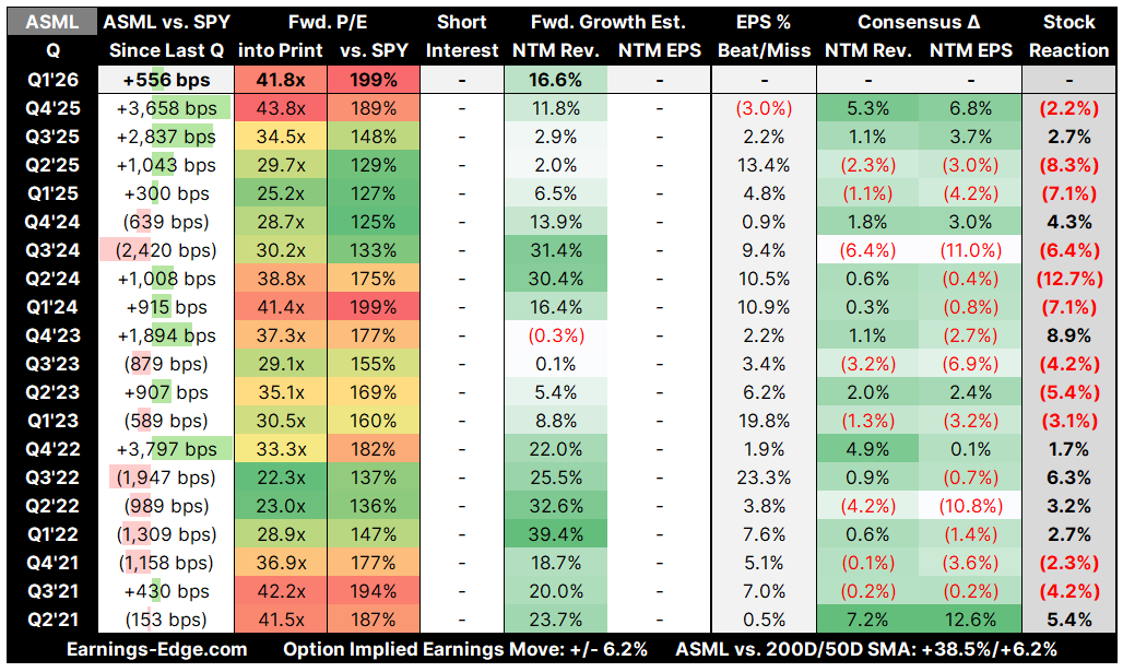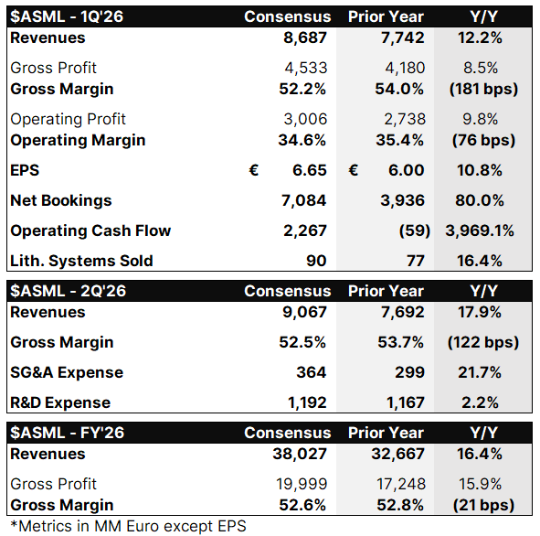 We get 1Q results from ASML at 1AM ET overnight tonight. This post outlines Consensus expectations for 1Q and forward guidance, the historical valuation context, and our Bull / Bear Bullets overviewing the long and short theses.