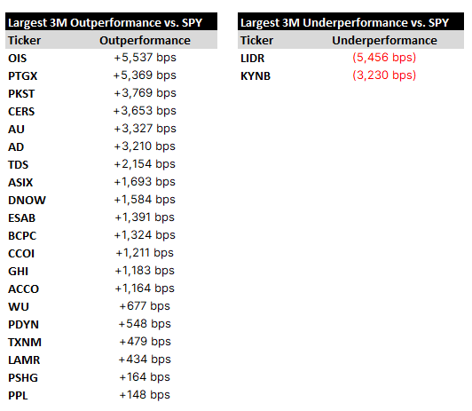 Relative winners and losers over the last quarter, followed by particular names of note, concluding with a spreadsheet containing setup tables for all of the day’s reporters.
