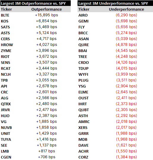 Relative winners and losers over the last quarter, followed by names of note, concluding with a spreadsheet containing setup tables for all the day’s reporters.