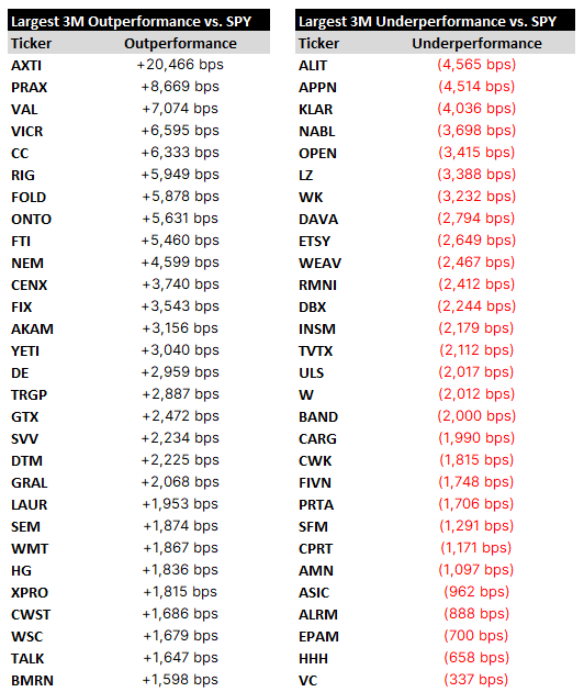 Relative winners and losers over the last quarter, followed by particular names of note, concluding with a spreadsheet containing setup tables for all of the day’s reporters.