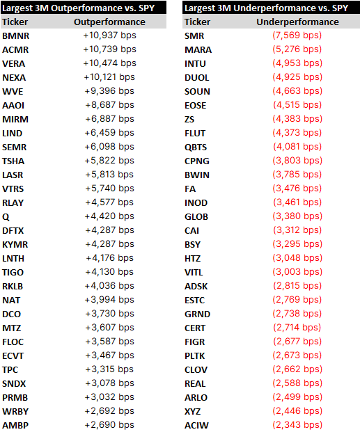 Relative winners and losers over the last quarter, followed by particular names of note, concluding with a spreadsheet containing setup tables for all of the day’s reporters.