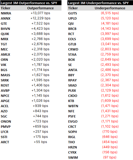 Relative winners and losers over the last quarter, followed by names of note, concluding with a spreadsheet containing setup tables for all of the day’s reporters.