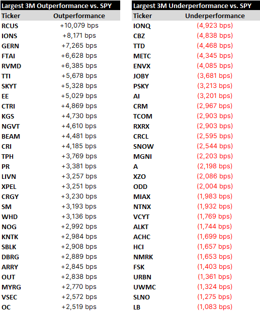Relative winners and losers over the last quarter, followed by particular names of note, concluding with a spreadsheet containing setup tables for all of the day’s reporters.