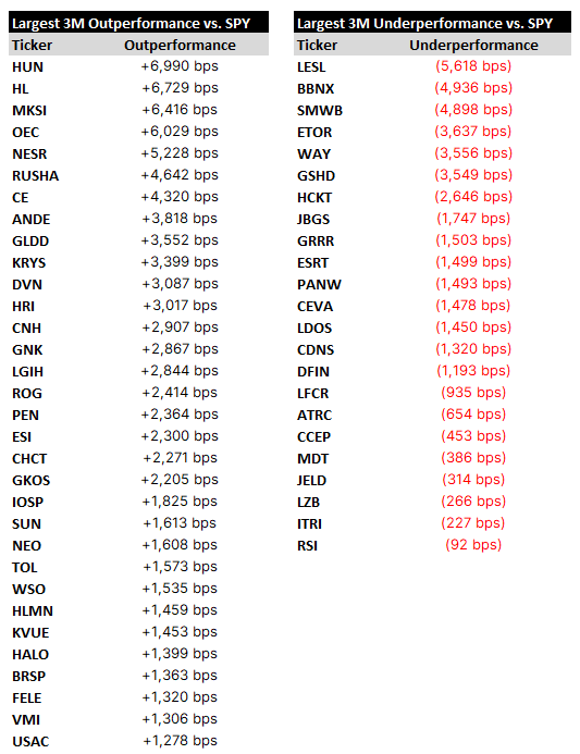 Relative winners and losers over the last quarter, followed by particular names of note, concluding with a spreadsheet containing setup tables for all of Tuesday’s reporters (Monday is a holiday).