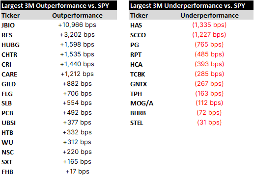 Relative winners and losers over the last quarter, followed by names of note, concluding with a spreadsheet containing setup tables for all of the day’s reporters.