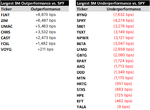 Relative winners and losers over the last quarter, followed by names of note, concluding with a spreadsheet containing setup tables for all of the day’s reporters.