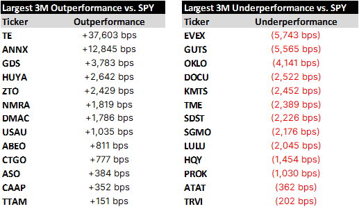Relative winners and losers over the last quarter, followed by names of note, concluding with a spreadsheet containing setup tables for all of the day’s reporters.