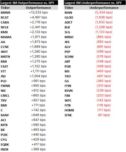 Relative winners and losers over the last quarter, followed by names of note, concluding with a spreadsheet containing setup tables for all 60+ of the week’s reporters.