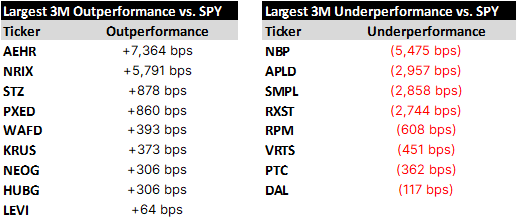 Relative winners and losers over the last quarter, followed by names of note, concluding with a spreadsheet containing setup tables for all of the day’s reporters.