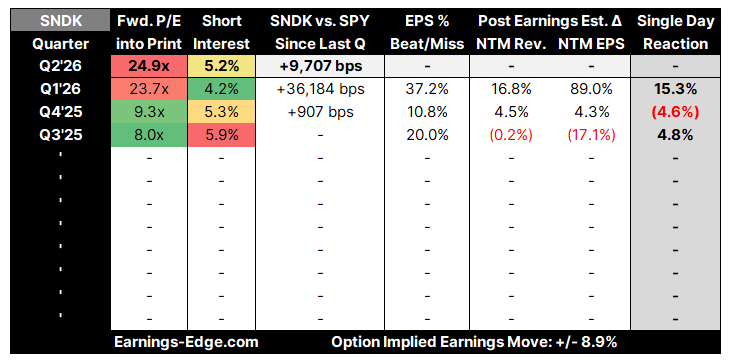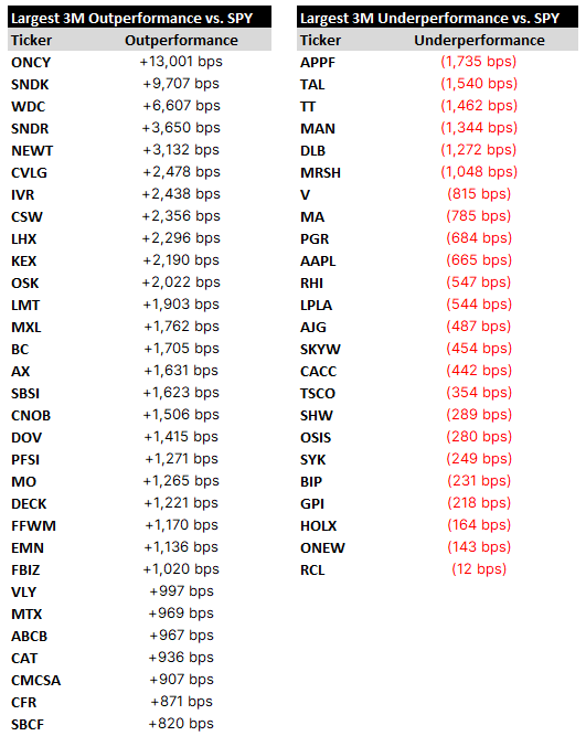 Let’s start by looking at the relative winners and losers over the last quarter, followed by particular names of note, concluding with a spreadsheet containing setup tables for all of Thursday’s reporters.