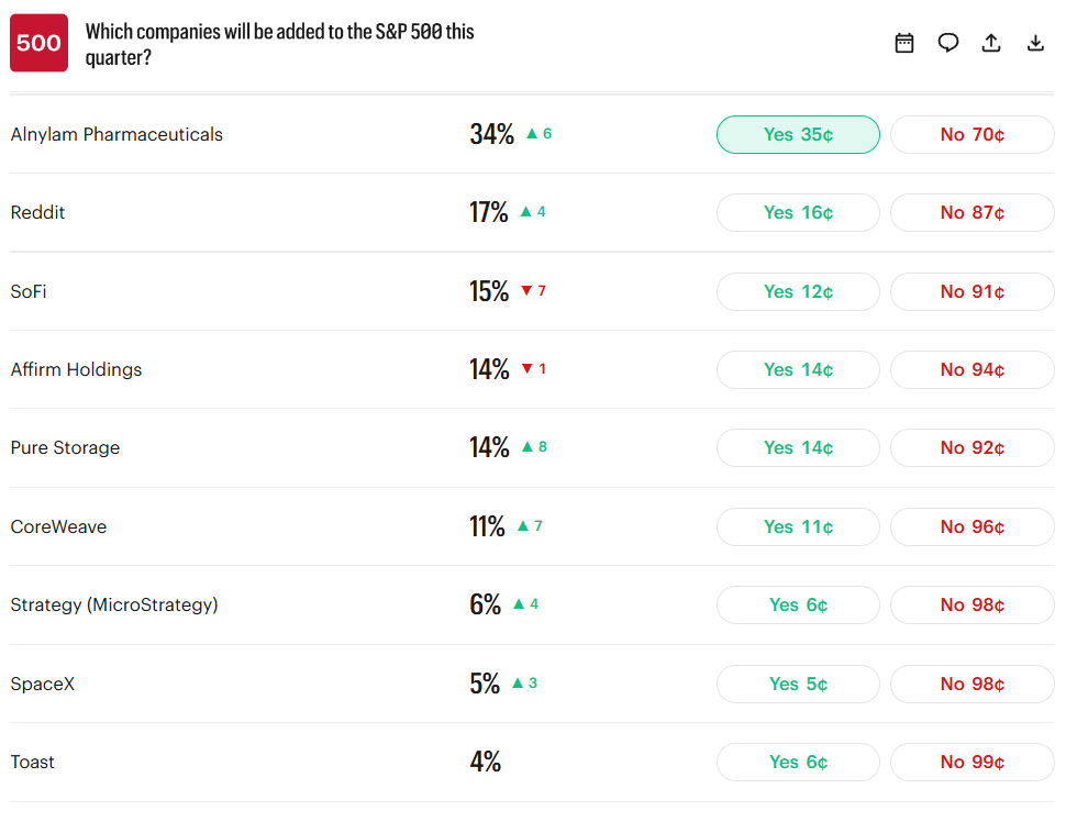 We have a one-off event next week that will result in a new S&P 500 member announcement (details later), and I believe the new member is not even in this Kalshi event market list: